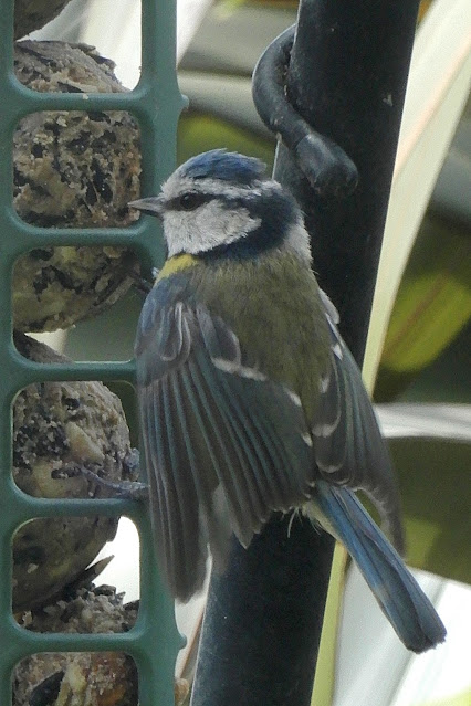 Bluetits are commoner now than they used to be, I suspect that this is because they have nests that tie them to the area. I have three distinct ones from East, West and South carrying scraps of fatball back to their young.